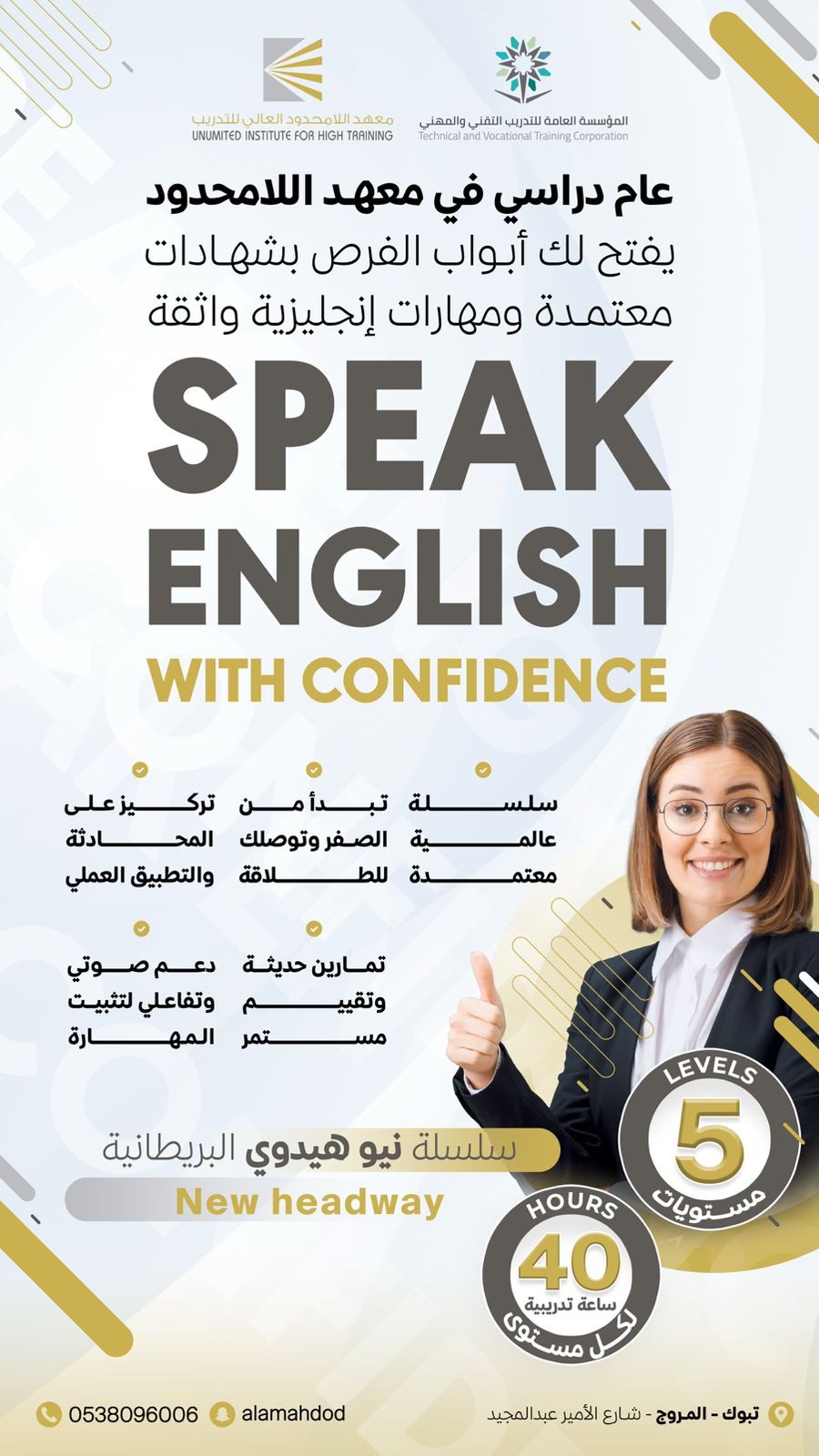 لتطوير اللغة الانجليزية خمس مستويات مقر الدورة ( معهد اللامحدود - تبوك ) التدريب التعاوني في اي مكان ترغبين به اختيار فترات الدوام الفترة الصباحية من...