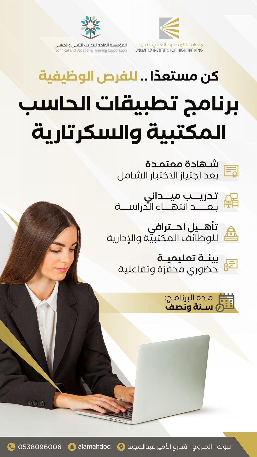 للراغبين بالعمل في المجالات الادارية للقطاعين العام والخاص مدة البرنامج عام ونصف مقر البرنامج ( معهد اللامحدود - تبوك ) التدريب التعاوني في اي مكان تر...
