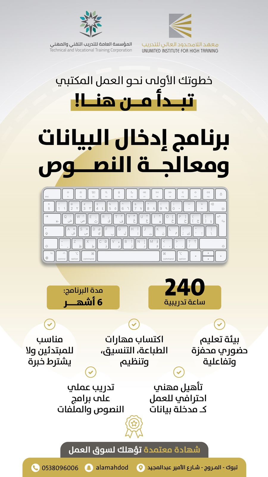 دعم المؤهلات لتتناسب مع احتياجات سوق العمل بشهادة معتمدة ومصنفة في موقع جدارات مدة الدبلوم عامين ونصف مقر الدبلوم ( معهد اللامحدود - تبوك ) التدريب ال...