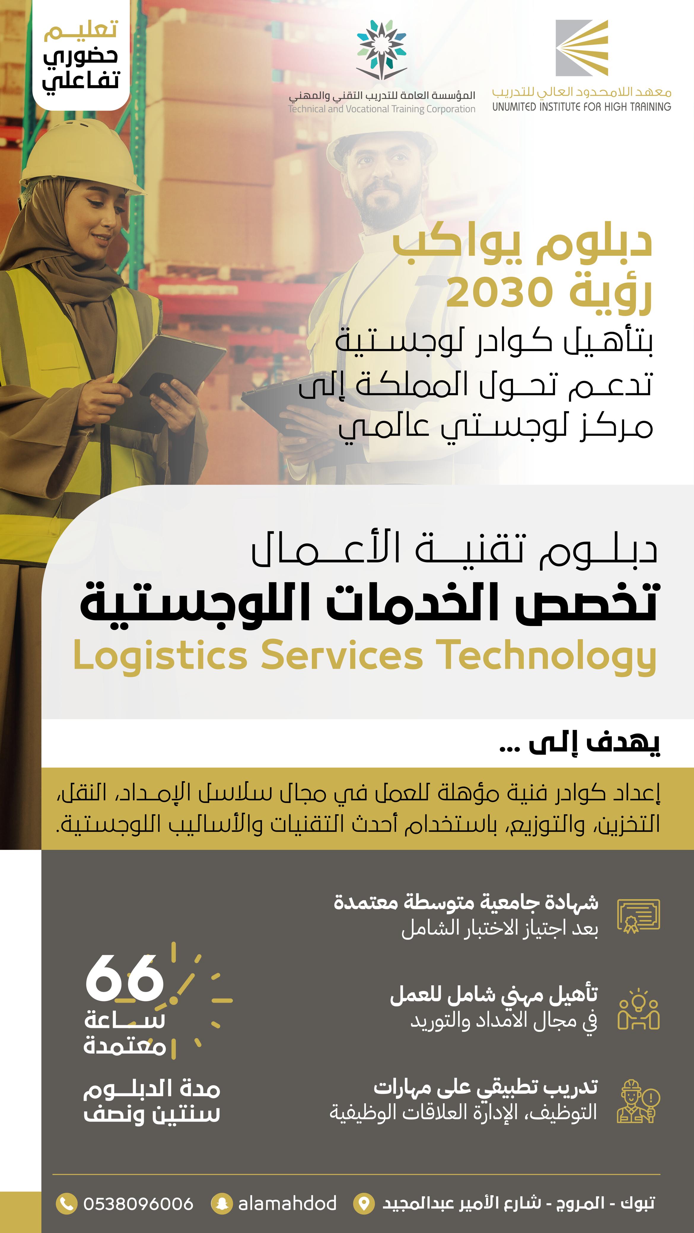 دبلوم الخدمات اللوجستية هو برنامج تدريبي يهدف إلى تأهيل المتدربين للعمل في مجال إدارة سلسلة الإمداد والنقل والتخزين والتوزيع. يركز الدبلوم على تزويد ا...